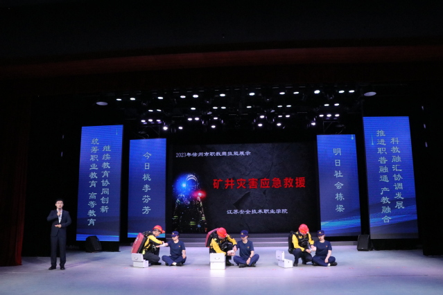 在职业教育办学成果展示环节,我院学生生动展示了矿井灾害应急救援技能,本次展示包括重达25公斤的应急设备规范穿戴、设备安全自检、创伤包扎等环节,动作整齐、口号响亮,充分体现了应急救援技术专业教育成果,展示了专业的应急救援技能,获得了现场观众的一致好评。